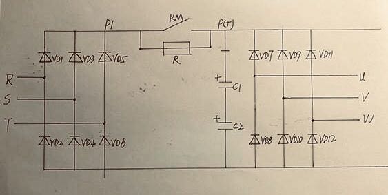 用數(shù)字式萬(wàn)用表測(cè)量二極管,將R、S、T搭接紅表筆,P(+)端搭接黑表筆,測(cè)得的是整流二極管VD1、VD3、VD5的正向壓降,為0.5V左右,數(shù)值顯示為540;如將表筆反接,則所測(cè)壓降為無(wú)窮大。如用指針式萬(wàn)用表,黑表筆搭接R、S、T端,紅表筆搭接P(+)端,則顯示7KR正向電阻;表筆反接,則顯示數(shù)百KR。因充電電阻的阻值一般很小,如圖3-1所示電路,僅為幾歐,小功率機(jī)型為幾十歐,測(cè)量中可將其忽略不計(jì)。但測(cè)其R、P1正向電阻正常,而R、P(+)之間正向電阻無(wú)窮大(或直接測(cè)量KM常開(kāi)觸頭之間電阻為無(wú)窮大),則為充電電阻已經(jīng)開(kāi)路了。