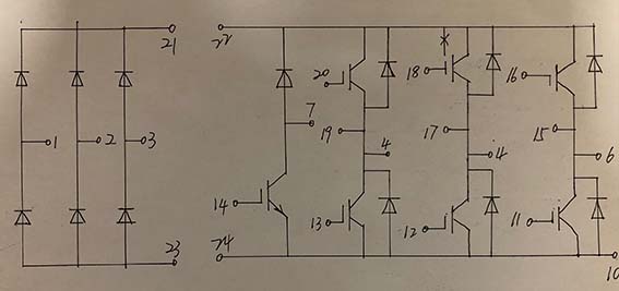 需要說(shuō)明的是,橋式整流電路用的是低頻整流二極管模塊,正向壓降和正向電阻較大,同于一般硅整流二極管。而IGBT上反向并聯(lián)的6只二極管是調(diào)整二極管,正向壓降和正向電阻較小,正向壓降為0.35V左右,指針式萬(wàn)用表測(cè)量正向電阻為4KR左右。