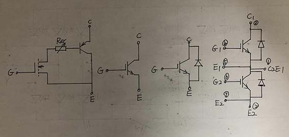 以上說(shuō)到對(duì)端子電阻的測(cè)量只是大致判定IGBT的好壞,尚不能最后認(rèn)定IGBT就是好的,簡(jiǎn)易測(cè)量后,就對(duì)客戶(hù)說(shuō),輸出模塊是好的,會(huì)給自己帶來(lái)極大的被動(dòng),IGBT的好壞還需進(jìn)一步測(cè)量驗(yàn)證。如何檢測(cè)IGBT的好壞,得首先從IGBT的結(jié)構(gòu)原理入手,找到相應(yīng)有效的測(cè)量方法,如圖所以為IGBT等效電路和單、雙管模塊引腳圖。